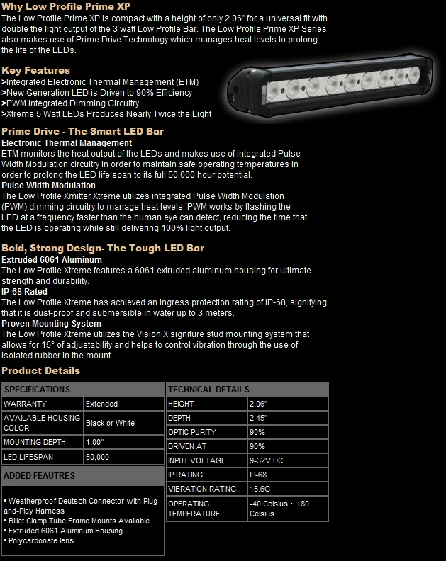 The Xmitter Low Profile Xtreme Bar, using 5 Watt LEDs, achieves the beam pattern control of a 3 watt LED with the light output of a 10 watt LED, with 2x the output of the LoPro 3 Watt. It also boasts an extra low mounting depth and height and utilizes Vision X Prime Drive